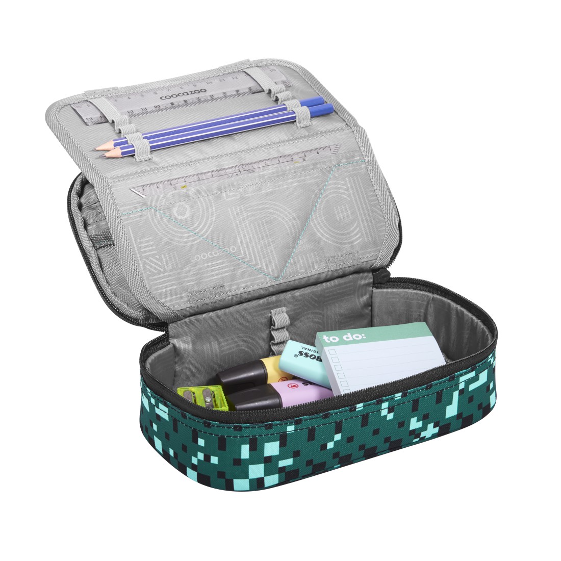 Großes Hauptfach, Reißverschlussfach im Deckel, klappbare Flap mit Stiftehalterungen und Klettverschluss, Stundenplanfach, Fach für Geodreieck, Fach für Lineal.