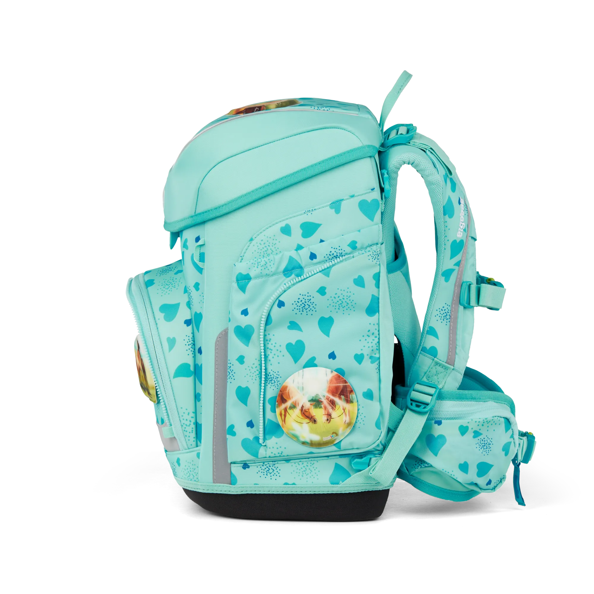 5 -teiliges Set, höhenverstellbares Tragesystem „Your-Size-System“, hoher Tragekomfort durch breite, gepolsterte Beckenflossen, gute Sichtbarkeit durch Reflektoren rundherum, fest angenähte Seitentaschen, Loop zum Anbringen von Hangies, Fahrkartenfach am Beckengurt, Kinderleichtes Öffnen und Schließen des Klappdeckels, Individualisierbar durch Kletties, Hangies, Zippies und Zip-Sets, Größe: 28 x 40 x 25 cm (B/H/T), Gewicht 1100 g, Volumen 20 Liter, Hauptstoff 100% Polyester, aus 39 recycelten PET-Flaschen (0,5 l), Wasser- und schmutzabweisend, Pflegehinweise: Nicht waschen, nicht bleichen, nicht im Trockner trocknen, nicht bügeln, nicht trockenreinigen.
