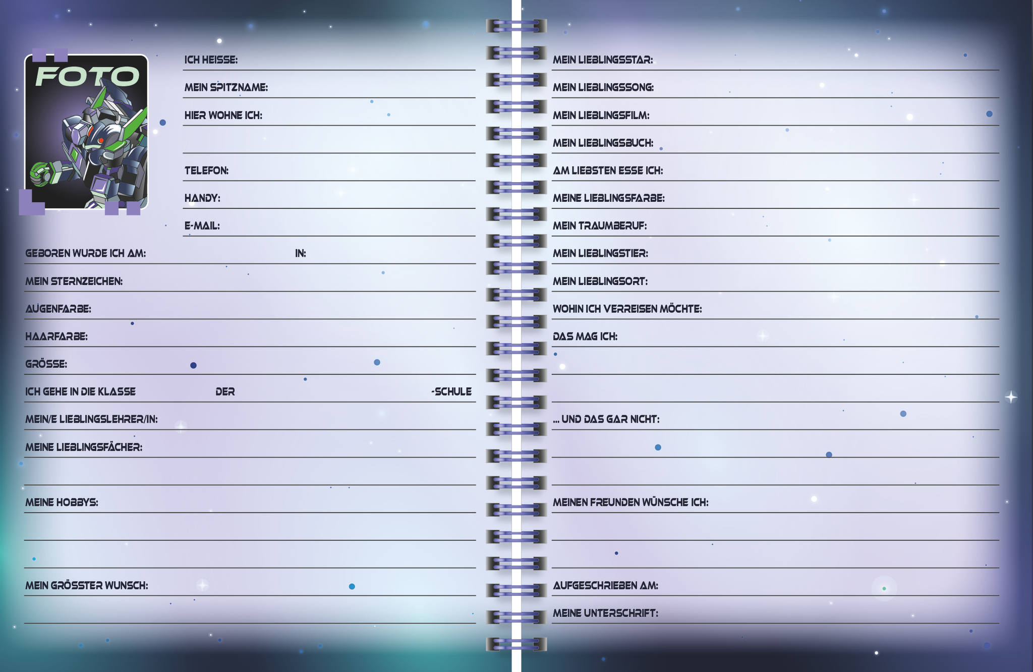 80 Seiten, Wire-O-Bindung, Grafik-Einband, Farbe: dunkelblau, partielle Metallicfolienveredelung, illustrierte Seiten, mit Geburtstagskalender und mit Stickerbogen