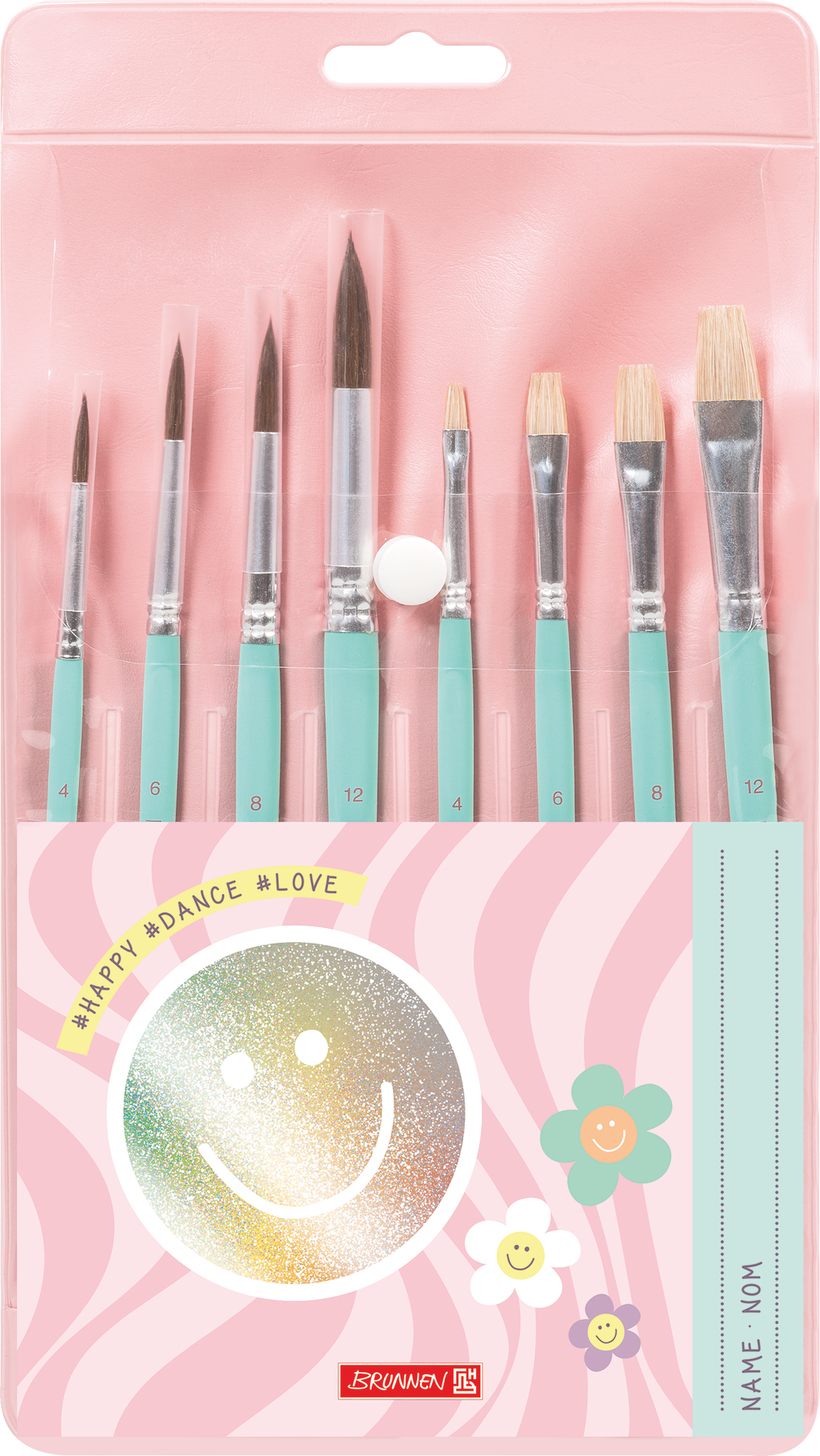 8 Pinsel, Stiele aus farbig lackiertem Holz, Farbe: mint, Pinselform: rund und flach, Inhalt: je 4 Feinhaarpinsel und 4 Borstenpinsel (Größe 4, 6, 8, 12), Kunststoffetui mit Namensschild, Pinselhaar: Borstenpinsel: 100 % Chungking Schweineborste, Feinhaarpinsel: 70 % Ponyhaar, 30 % Synthetikhaar, nahtlose Aluzwinge