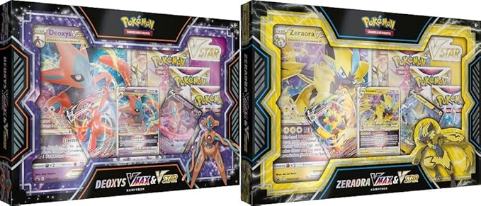 Pokémon Kollektion, Zeraora-VMAX&VSTAR / Deoxys-VMAX&VSTAR, 290-45425, (DE,NEU,OVP), 1 holografische Promokarten mit Zeraora-V/Deoxys-V, 1 geprägte holografische Promokarte mit Zeraora-VMAX/Deoxys-VMAX, 1 geprägte holografische Promokarte mit Zeraora-VSTAR/Deoxys-VSTAR, 1 überdimensionale geprägte holografische Karte mit Zeraora-VSTAR/Deoxys-VSTAR, 4 Boosterpacks des Pokémon-Sammelkartenspiels, 1Strategieleitfaden für den Einsatz dieser Karten zur Aufwertung deines Decks, 1 VSTAR-Kunststoffmarke, 1 Code-Karte für Pokémon-Sammelkartenspiel-Live