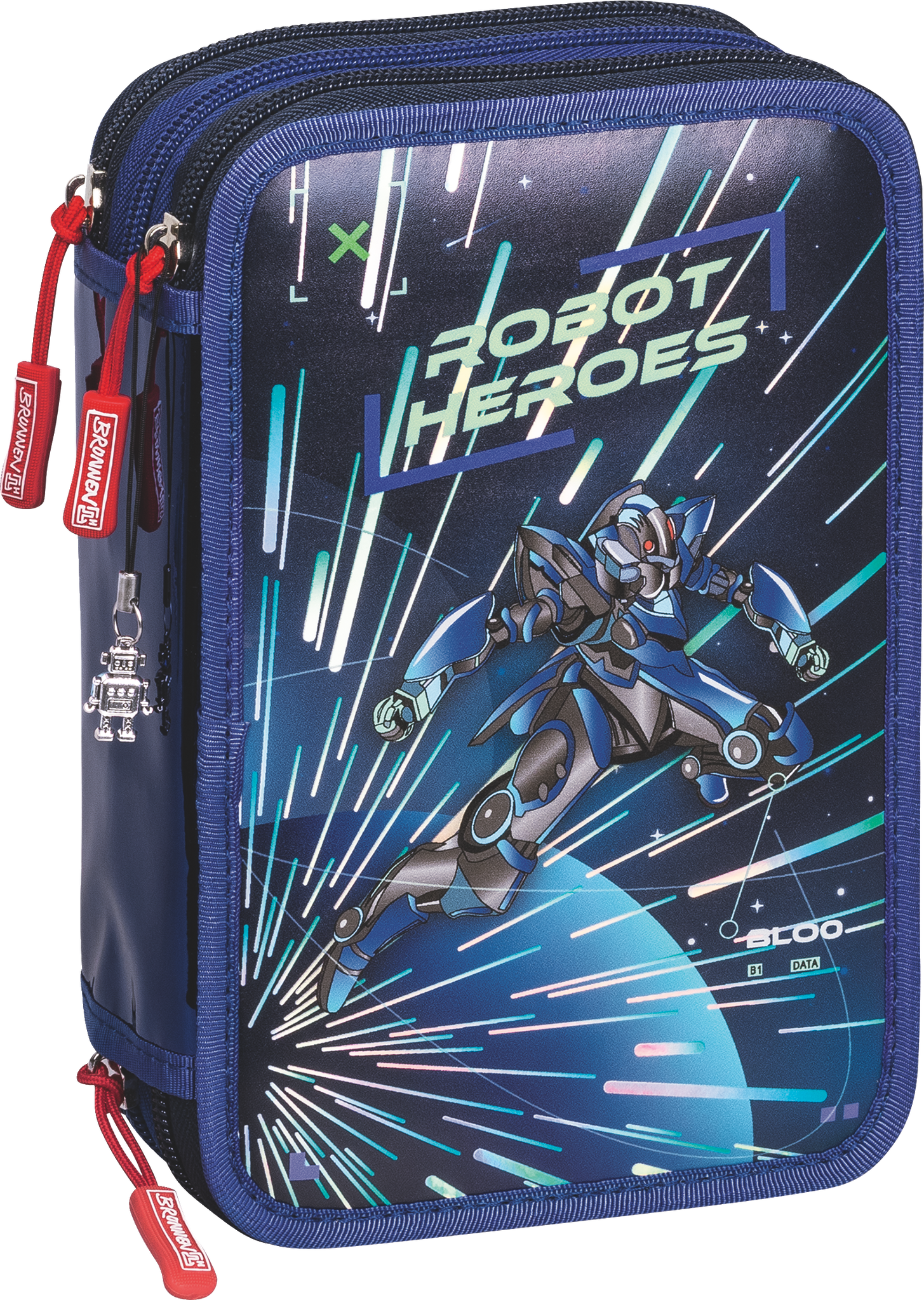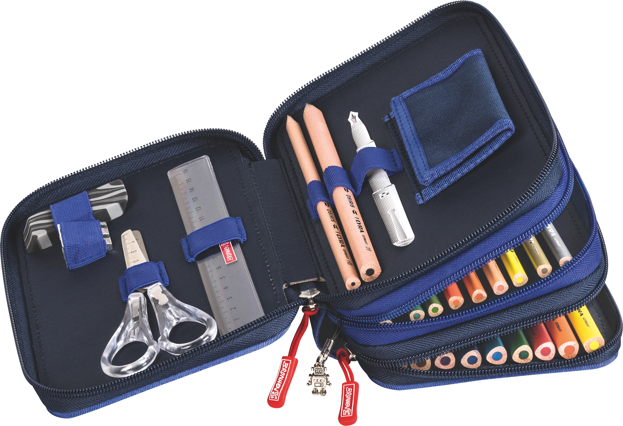 Kunstleder, Farbe: dunkelblau, 3 Reißverschlüsse, Inhalt: 18 dünne Markenbuntstifte, 9 dicke Markenbuntstifte, 2 Markenbleistifte, Lineal 16 cm, Metalldoppelspitzer, Radiergummi, Kinderschere, Geldfach mit Klettverschluss, mit Anhänger