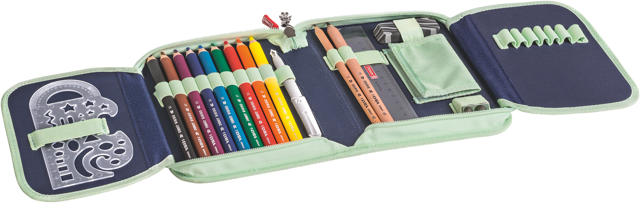 Kunstleder, Farbe: dunkelblau, mint, lila, 2 Klappe(n), Inhalt: 9 dicke Markenbuntstifte, 2 Markenbleistifte, Lineal 16 cm, Metalldoppelspitzer, Radiergummi, Geldfach mit Klettverschluss, Stundenplan, Zeichenschablone, mit Anhänger