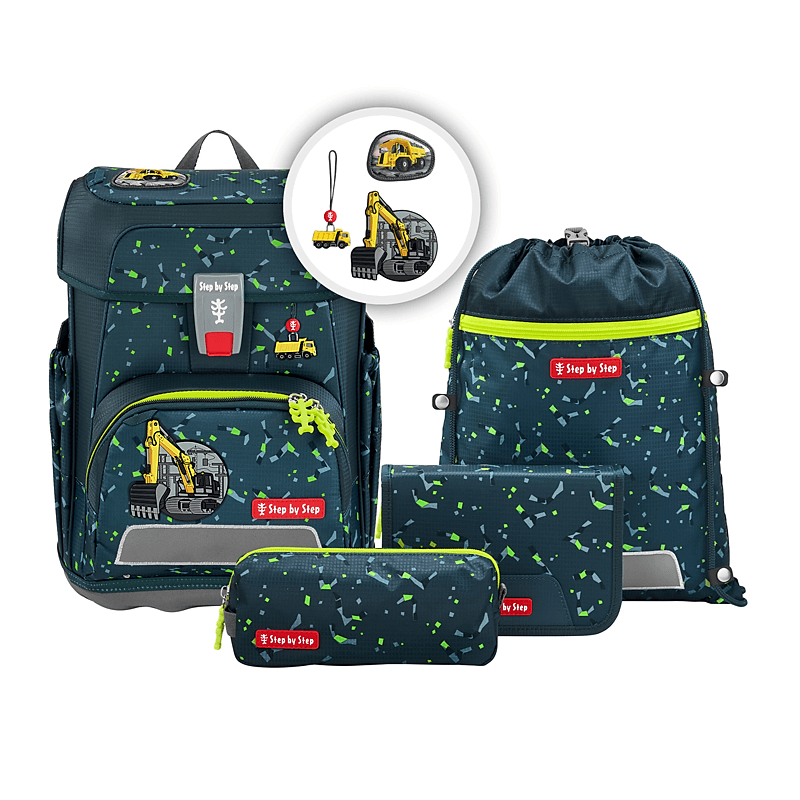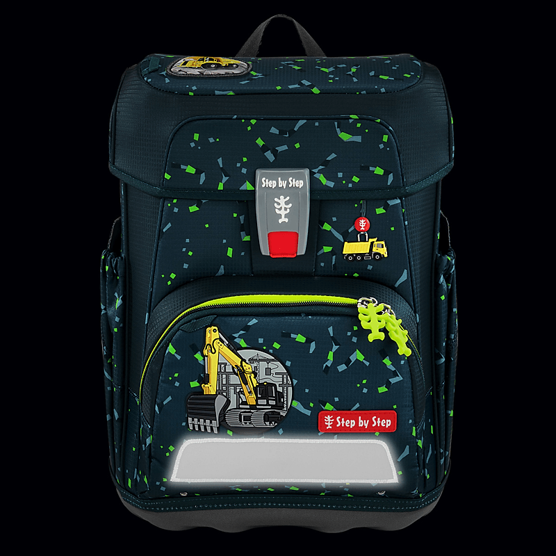 Ultraleichte Rückenkonstruktion aus Fiberglas, anatomisch geformte Schulterträger, höhenverstellbar (EASY GROW SYSTEM), Lageverstellriemen, höhenverstellbarer, abnehmbarer Brustgurt, abnehmbarer Hüftgurt, ergonomisch geformte Rückenpartie, atmungsaktives Rückenpolster, Verstaumöglichkeiten: Hauptfach mit integriertem Bücherfach, nach außen wachsende Vordertasche mit Auslaufösen, zwei offene, nach außen wachsende Seitentaschen mit Auslaufösen, Laschen zur Fixierung des Federmäppchens unter dem Deckel, Sicherheit: reflektierende Elemente von Regine IQtrim an Fronttasche, Seitenflächen und Schultergurten, weitere Features: leicht bedienbarer Fidlock-Magnetverschluss, Aufhängungen zum Verstauen der Enden der Schulterriemen, Aufhängeschlaufe, Stundenplan im Deckel, stabile, wasserdichte Bodenplatte, Technische Details: Gewicht: ca. 990g (Schulranzenkorpus ohne abnehmbare Elemente, wie MAGIC MAGS, Hüft- oder Brustgurt), Gesamtgewicht Schulranzen-Set: ca. 1.750g, Größe: 37,5 cm (H) / 28 cm (B) / 20 cm (T), Gesamtvolumen: 19l (Hauptfach: 15l, Seitentaschen: 3l, Fronttasche: 1l), Material: wasserabweisendes Polyester mit 100% PFC-freier und bluesign-zertifizierter Beschichtung, Textilien zu 100% aus recycelten PET-Flaschen, Lieferumfang: 1 Schulranzen, 1 Federmäppchen, komplett bestückt mit Markenstiften, Schlampermäppchen, 1 Sportbeutel, 1 Set MAGIC MAGS (2 Applikationen und 1 Anhänger)