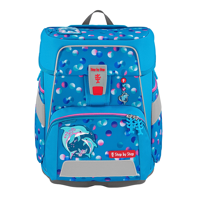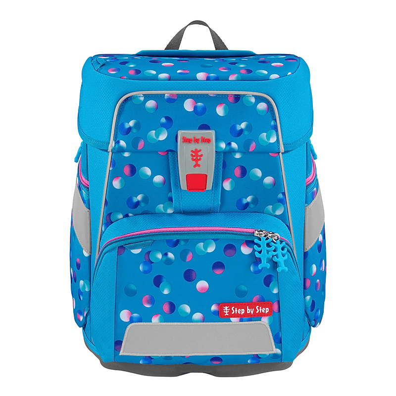 Anatomisch geformte Schulterträger, höhenverstellbar (EASY GROW SYSTEM), Lageverstellriemen, höhenverstellbarer Brustgurt, abnehmbarer Hüftgurt, vorgeformtes, weiches Rückenpolster. Verstaumöglichkeiten: Hauptfach, Vordertasche, zwei Seitentaschen mit Reißverschluss und Auslaufösen, Gummibänder zur Fixierung des Federmäppchens unter dem Deckel, Inneneinteiler mit Gummizug für Bücher. Sicherheit: Reflektierende Elemente aus ORALITE-Material an Fronttasche, Seitentaschen und Schultergurten. Weitere Features/tech. Details: Leicht bedienbarer Fidlock-Magnetverschluss, Aufhängungen zum Verstauen der Enden der Schulterriemen, Aufhängeschlaufe, Tragegriff, Stundenplan im Deckel, Gewicht: ca. 1.250g (Schulranzenkorpus ohne abnehmbare Elemente, wie MAGIC MAGS, Hüft- oder Brustgurt), Gesamtgewicht Schulranzen-Set: ca. 2.050g, Größe: 37 cm (H) / 28 cm (B) / 20 cm (T), Gesamtvolumen: 20l (Hauptfach: 15,5l, Seitentaschen: 3l, Fronttasche: 1,5l), Material: Polyester mit 100% PFC-freier und bluesign-zertifizierter Beschichtung, Textilien zu 100% aus recycelten PET-Flaschen. Lieferumfang:1 Schulranzen, 1 Federmäppchen, komplett bestückt mit Markenartikeln, 1 Schlampermäppchen, 1 Sportbeutel, 1 Set MAGIC MAGS (2 Applikationen und 1 Anhänger).