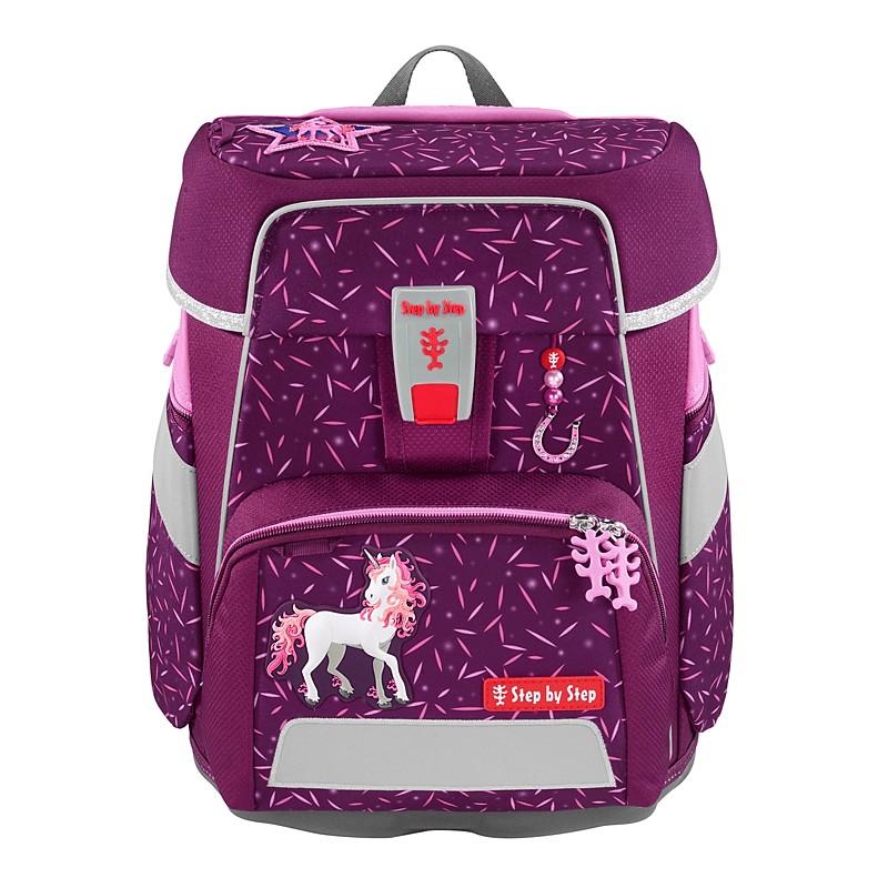 Anatomisch geformte Schulterträger, höhenverstellbar (EASY GROW SYSTEM), Lageverstellriemen, höhenverstellbarer Brustgurt, abnehmbarer Hüftgurt, vorgeformtes, weiches Rückenpolster. Verstaumöglichkeiten: Hauptfach, Vordertasche, zwei Seitentaschen mit Reißverschluss und Auslaufösen, Gummibänder zur Fixierung des Federmäppchens unter dem Deckel, Inneneinteiler mit Gummizug für Bücher. Sicherheit: Reflektierende Elemente aus ORALITE-Material an Fronttasche, Seitentaschen und Schultergurten. Weitere Features/tech. Details: Leicht bedienbarer Fidlock-Magnetverschluss, Aufhängungen zum Verstauen der Enden der Schulterriemen, Aufhängeschlaufe, Tragegriff, Stundenplan im Deckel, Gewicht: ca. 1.250g (Schulranzenkorpus ohne abnehmbare Elemente, wie MAGIC MAGS, Hüft- oder Brustgurt), Gesamtgewicht Schulranzen-Set: ca. 2.050g, Größe: 37 cm (H) / 28 cm (B) / 20 cm (T), Gesamtvolumen: 20l (Hauptfach: 15,5l, Seitentaschen: 3l, Fronttasche: 1,5l), Material: Polyester mit 100% PFC-freier und bluesign-zertifizierter Beschichtung, Textilien zu 100% aus recycelten PET-Flaschen. Lieferumfang:1 Schulranzen, 1 Federmäppchen, komplett bestückt mit Markenartikeln, 1 Schlampermäppchen, 1 Sportbeutel, 1 Set MAGIC MAGS (2 Applikationen und 1 Anhänger).